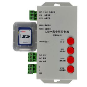 shop signs, LED matrixes and screens and many more applications. It supports advanced pixel layouts all configurable from the software provided (LedEdit 2013). Each controller supports up to a maximum of 2048 pixels. More than one controller can be chained together to enable larger displays. All programs are stored on the SD card provided (16 programms MAX) and can be cycled through with a push of a button on the controller. The speed of each program can also be adjusted with buttons on the controller.